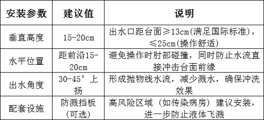 醫療機構通用洗手池設計:水龍頭出水口距臺面15-20cm為最佳,兼顧防濺與操作
