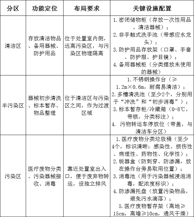 處置室必須按“清潔區(qū)、半污染區(qū)、污染區(qū)”三區(qū)劃分,分區(qū)清晰、標(biāo)識明確,可通過物理隔斷(墻體、玻璃)或地面標(biāo)線(不同顏色)分隔,嚴(yán)禁混放物品和交叉穿行。