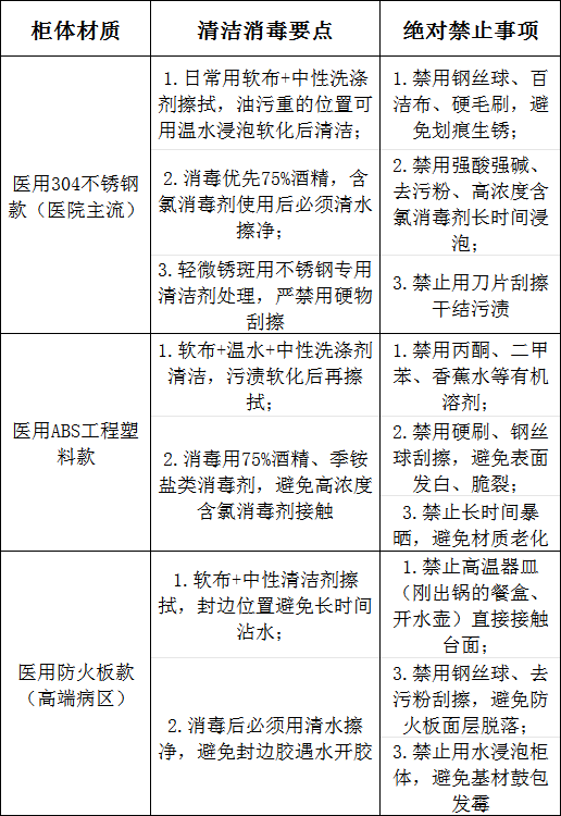 不同材質(zhì)耐腐蝕性、耐消毒特性差異極大,錯(cuò)誤操作會(huì)直接導(dǎo)致柜體報(bào)廢、形成藏菌死角。