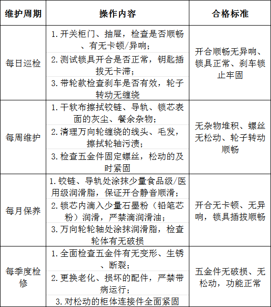 醫(yī)院配餐柜日均開(kāi)關(guān)次數(shù)超10次,鉸鏈、導(dǎo)軌、鎖具等五金是損耗重災(zāi)區(qū),必須按周期維護(hù),避免突發(fā)損壞引發(fā)磕碰、墜落風(fēng)險(xiǎn)。