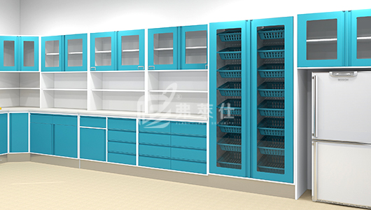 治療室一般配置:治療柜、藥品柜、耗材柜、水槽柜、垃圾柜等。處置室一般配置為:治療柜、耗材柜、器械柜、治療車、水槽柜、垃圾柜。柜體采用電解鋼板,臺面采用復合亞克力制作,易清潔、抗污垢、耐沖擊、耐高溫以及具有阻燃性 , 無毒無輻射性,符合醫院高標準的環境衛生要求。
