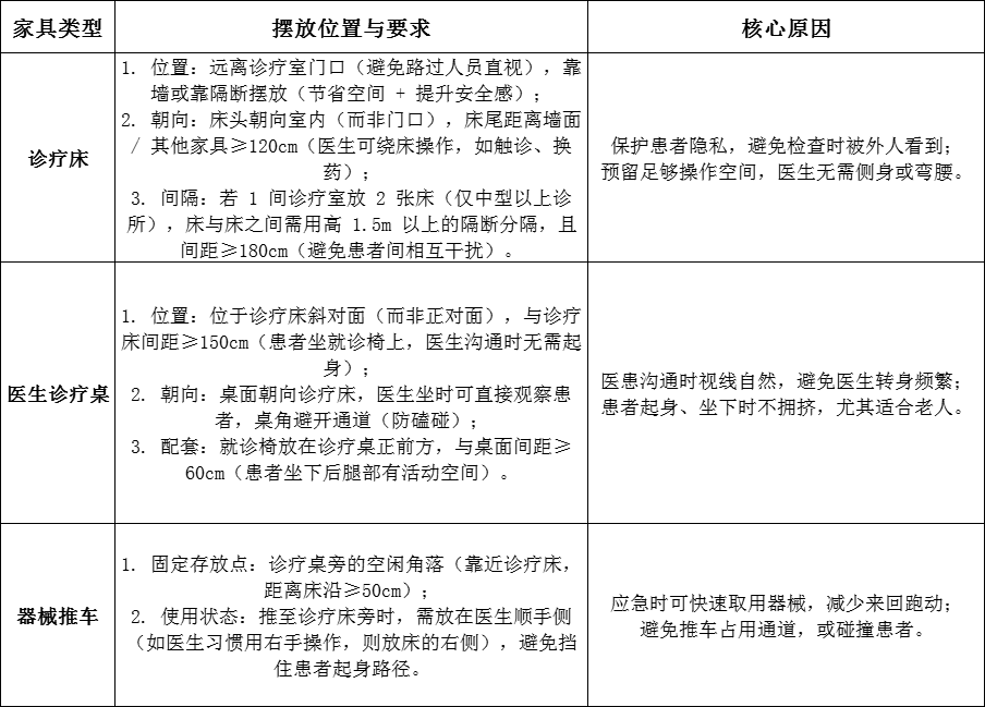 擺放后需對照《醫療機構診所基本標準》檢查:治療區與生活區(如醫生休息室)是否分開,藥品存儲是否符合溫濕度要求,通道是否暢通。