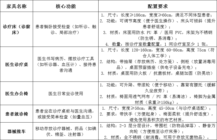 空間適配:小型診所(≤50㎡)可簡化配置(如合并診療區與治療區),大型診所需按功能分區明確家具布局,避免交叉污染;