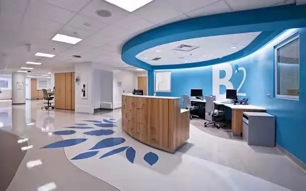 每個樓層都有不同主題色和卡通形象,病區(qū)地面上都有卡通形象,診床根據(jù)汽車形狀設(shè)計制作,例如有熊的腳印引導患者到達不同的區(qū)域。總之,整個家具和周圍的裝飾環(huán)境、顏色搭配、尺寸等都要相協(xié)調(diào)。